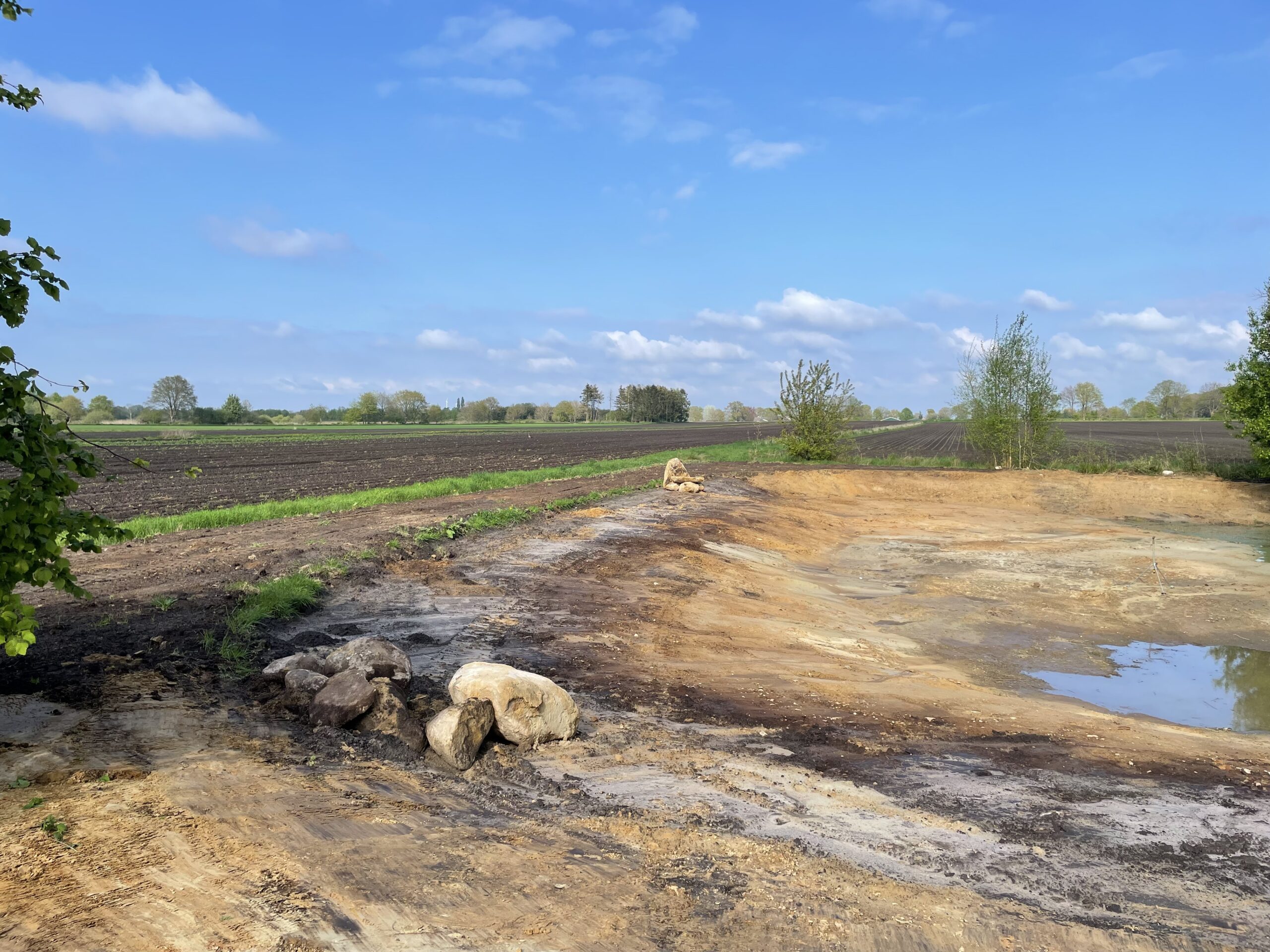 In het voorjaar van 2025 heeft Landschapsbeheer Drenthe een grote poel in onze tuin aangelegd. Het doel is om een geschikt leefgebied te creëren voor de knoflookpad (Pelobates fuscus), een zeer zeldzame soort die hier in de buurt voorkomt. Sterker nog: even verderop, op de schaatsbaan, leeft de grootste populatie van deze pad in Nederland.
