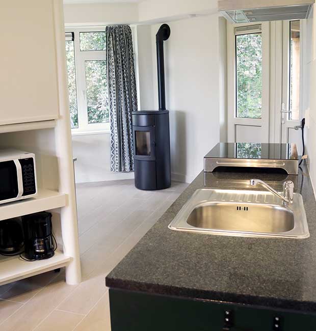 Het huis is voorzien van een overkapping en eigen tuin. Het gastenverblijf is 40m2 groot en het is volledig gelijkvloers. Het verblijf heeft een ruime leefruimte: zithoek met bank en fauteuil, een moderne keuken, eethoek, en open slaapgedeelte met een tweepersoonsbed met boxspringmatrassen. Het huis is met veel raampartijen gericht op het bijzondere uitzicht, waardoor u (bijna) het gevoel heeft buiten te leven. Door de goede isolatie blijft het huis in de zomer lekker koel. In de winter is het dankzij de gezellige palletkachel en vloerverwarming aangenaam warm. Uiteraard heeft het huis een luxe badkamer met wastafel, douchecabine en een toilet. Er is parkeergelegenheid op eigen terrein.